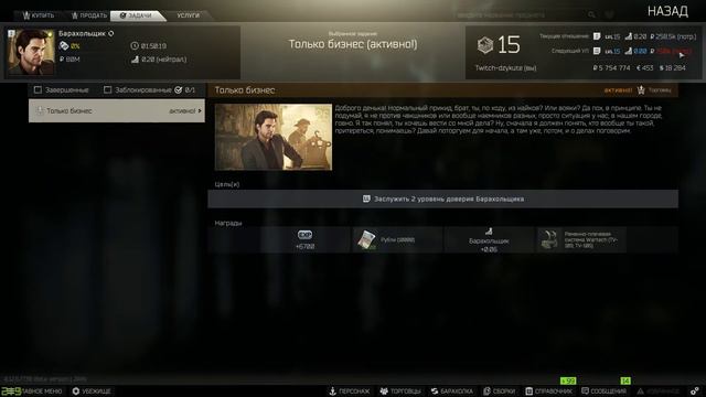 Выполнение квеста только бизнес в Escapa From Tarkov. В данном видео, я покажу как выполнить квест проверка на вшивость, который выдает нам барахольщика. Наградой за квест будет: +0.06 Репутация с Барахольщиком 6 700 Опыта 10 000 Рублей Ременно-плечевая система Wartech На данный момент чтобы пройти этот квест вы просто должны поднять торговый оборот с Барахольщиком до 750 тысяч. В эту сумму входят как покупки так и продажи. #EFT #барахольщик #гайды #квесты