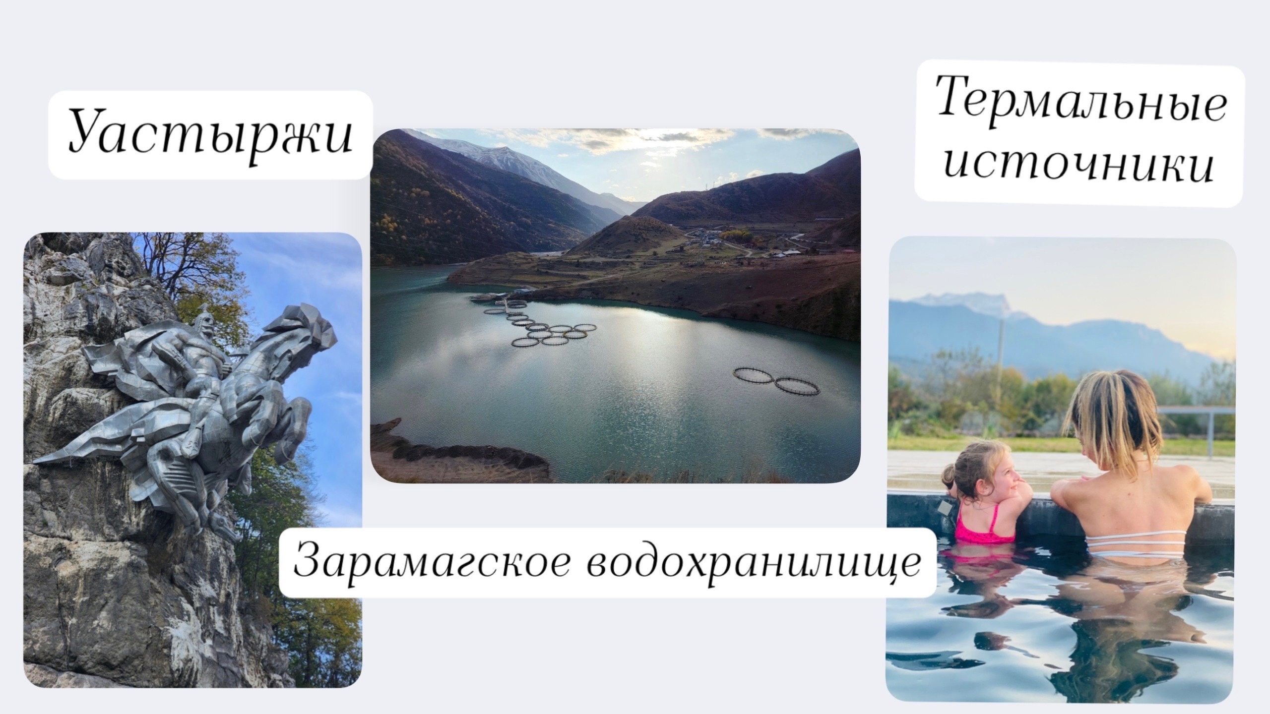 ?42.958572,44.211832 Монумент Уастырджи у дороги. ?42.793438,44.005683 Руки с сосной арт объект. ?42.794582,44.004346 Рог арт объект. ?42.696149,43.976940 Коста арт объект, смотровая, Зарамагское водохранилище. ?42.995931,44.229244 Верхний Бирагзанг (термальные ванны).