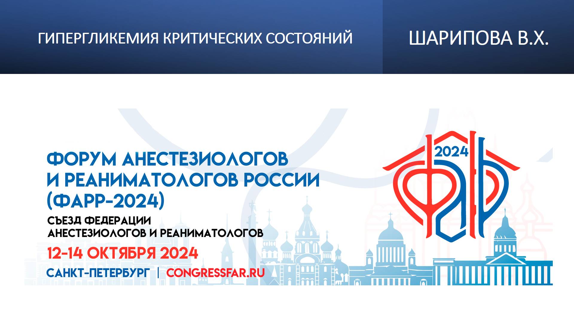 Видеозапись ФАРР-2024, XXII съезд Федерации анестезиологов и реаниматологов 12-14 октября 2024, Санкт-Петербург. Висолат Хамзаевна Шарипова "Гипергликемия критических состояний" Информация, размещенная на канале, предназначена исключительно для медицинских специалистов