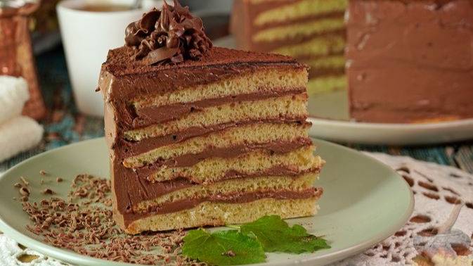 Гармоничное сочетание тонких бисквитных коржей и масляно-шоколадного крема. Торт посыпается какао и украшается розочками из сливочно-шоколадного крема. #БисквитныйТорт #ВенгерскийТортШтефания #ТортсШоколаднымКремом #ТортсМасляно-ШоколаднымКремом #ПраздничныйТорт