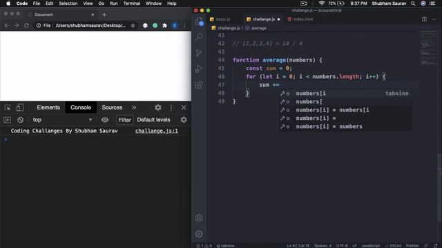 This is the fourth coding challenge and it's going to be alike the second challenge. If you have done the second challenge then this will be an easy but fun challenge for you. In this challenge, we will write code to find the average of an array. Let's Code! If you like my content, do support me by buying my course. All the coding challenges will be posted first in the course and then on the channel. You will also get personalized support and a say in which topic you want me to cover next. The course link is available below. Thank you! Javascript Course: https://www.udemy.com/course/learn-javascript-step-by-step-in-hindi/?referralCode=418E9FB786EE5874B55D Connect With Me: Twitter: https://twitter.com/hishubhamsaurav/ Instagram: http://instagram.com/hiShubhamSaurav/ Facebook: https://www.facebook.com/hiShubhamSaurav/ DEV: https://dev.to/shubhamsaurav/