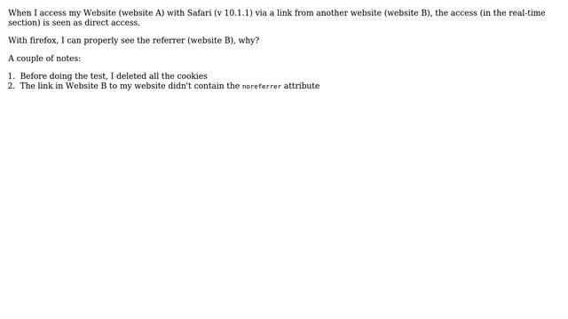 Webmasters: When I access my Website with Safari, Google Analytics shows referrers as "Direct", why? Helpful? Please support me on Patreon: https://www.patreon.com/roelvandepaar With thanks & praise to God, and with thanks to the many people who have made this project possible! | Content (except music & images) licensed under CC BY-SA https://meta.stackexchange.com/help/licensing | Music: https://www.bensound.com/licensing | Images: https://stocksnap.io/license & others | With thanks to user Nandla (webmasters.stackexchange.com/users/93269), user Fahad Ur Rehman Khan (webmasters.stackexchange.com/users/97151), user Eugenio (webmasters.stackexchange.com/users/67732), user DocRoot (webmasters.stackexchange.com/users/52912), and the Stack Exchange Network (webmasters.stackexchange.com/questions/117758). Trademarks are property of their respective owners. Disclaimer: All information is provided "AS IS" without warranty of any kind. You are responsible for your own actions. Please contact me if anything is amiss at Roel D.OT VandePaar A.T gmail.com