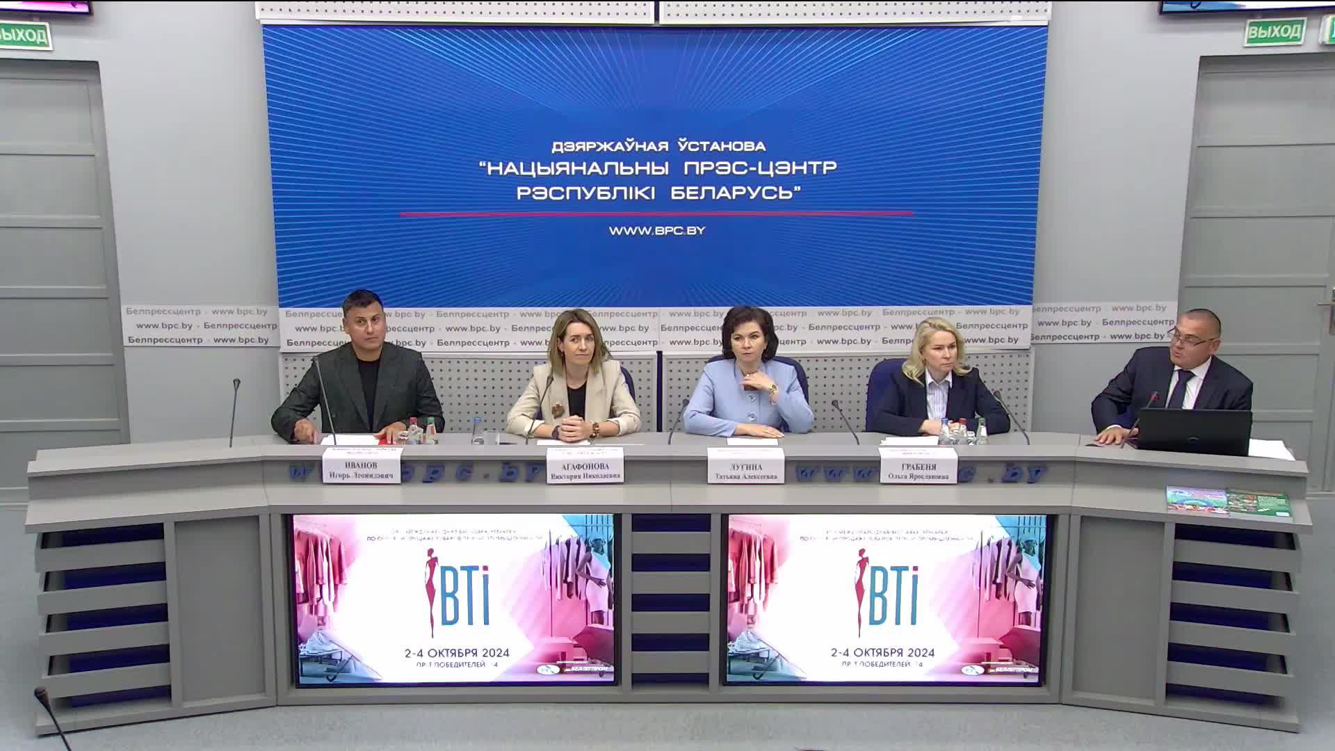 Лугина Татьяна Алексеевна - Председатель Белорусского государственного концерна по производству и реализации товаров легкой промышленности; Грабеня Ольга Ярославовна - начальник Управления внутренней торговли и выставочной деятельности концерна «Беллегпром»; Агафонова Виктория Николаевна - заместитель директора по выставочной деятельности республиканского унитарного предприятия «Национальный выставочный центр «БелЭкспо» Управления делами Президента Республики Беларусь; Игорь Иванов - заведующий отделом моды и дизайна Национального центра творчества детей и молодежи Задать вопрос: vopros@bpc.by Вся самая актуальная и оперативная информация о пресс-мероприятиях Национального пресс-центра Республики Беларусь будет публиковаться на нашем телеграм-канале. Подписывайтесь на нас: https://t.me/s/belpresscenter