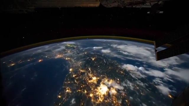 Many wonders are visible when flying over the Earth at night. A compilation of visual spectacles was captured recently from the International Space Station (ISS) and set to stimulating music. Passing below the space station are white clouds, orange city lights, lightning flashes inside thunderstorms and an abundance of dark blue seas. Seen on the horizon is a golden haze of Earth's thin atmosphere, decorated by dancing auroras as the video progresses. The mesmerizing green streams of light typically remain below the space station, However , the station frequently flies by the red and purple aurora peaks providing a captivating view for the crew. . The Theme music is from the Solaris Movie 2002 " First Sleep"