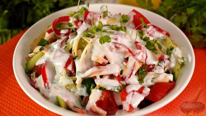 Словацкий салат из свежих овощей, зелени, ветчины и сыра заправляется растительным маслом с лимонным соком, а при подаче поливается сметаной. #Салаты #СалатСловацкий #СалатОвощной #СалатСВетчиной #СалатПраздничный
