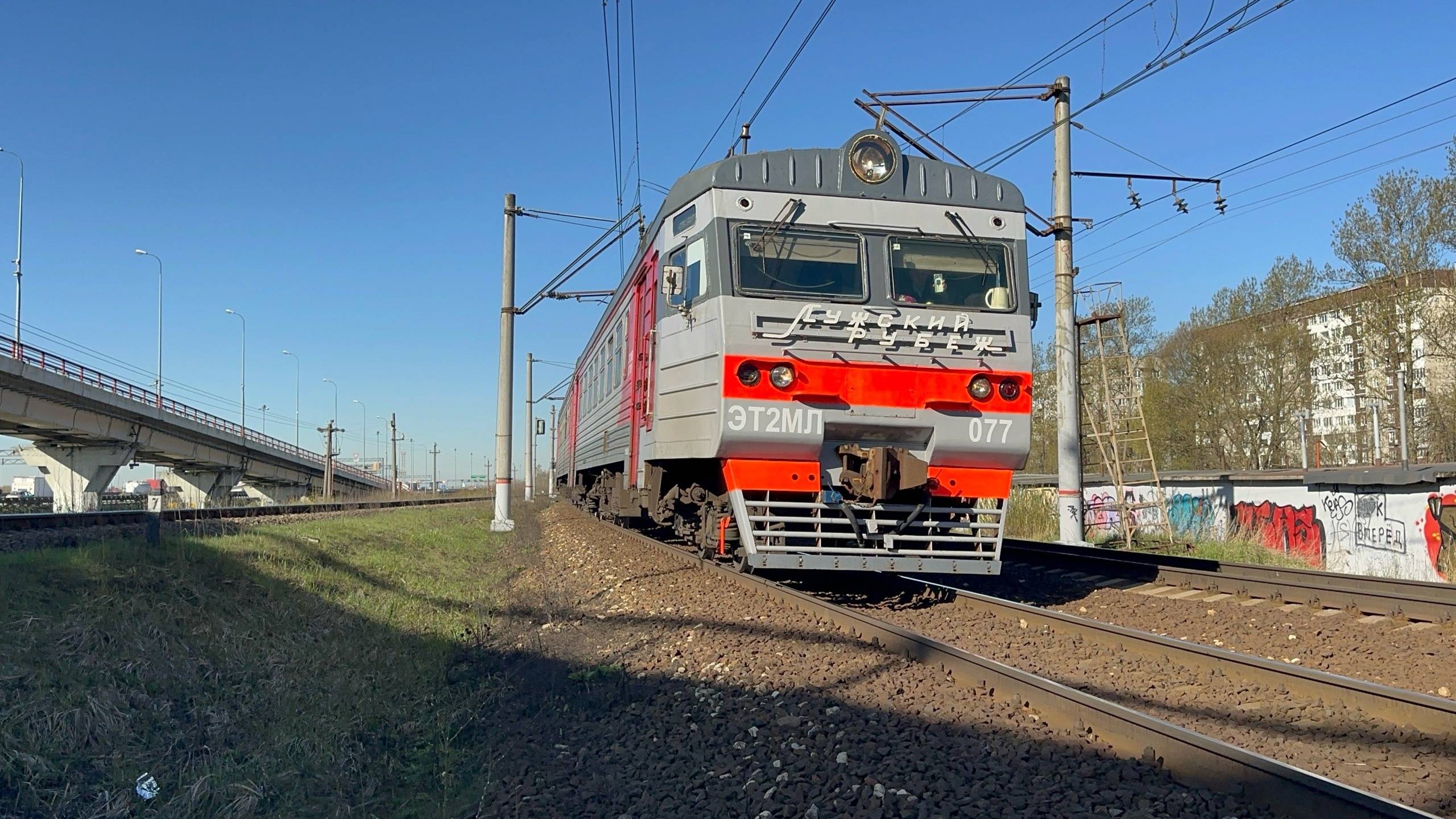 "Злая бригада!" Электропоезд ЭТ2МЛ - 077 "Лужский Рубеж" на перегоне следует резервом, май 2025 г