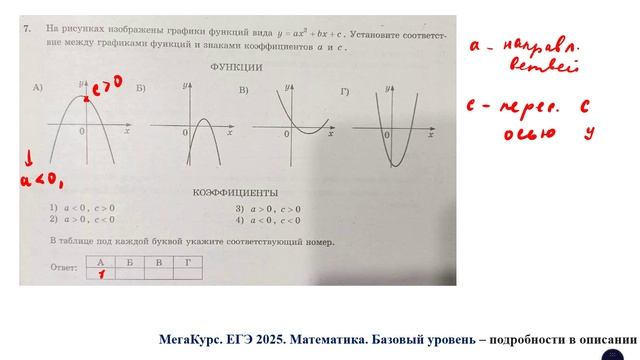 Задание 7 из базового уровня ЕГЭ по математике: На рисунках изображены графики функций вида y=ax^2 + bx + c. Установите соответствие между графиками функций и знаками коэффициентов a и c. В таблице под каждой буквой укажите соответствующий номер. Курс по всем заданиям 1 - 21 базового уровня ЕГЭ по математике: https://stepik.org/a/174709 Группа ВК: https://vk.com/egeroombaza #егэ #математика #база