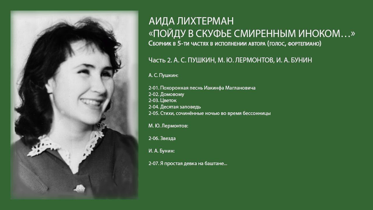 Аида Лихтерман «Пойду в скуфье смиренным иноком…». Сборник песен в 5-ти частях в исполнении автора (голос, фортепиано). От автора: Материалом для создания этого «звучащего» сборника послужили рабочие аудиозаписи песен, появившихся в давние уже времена – 60-е – 80-е годы 20 столетия, певшихся тогда в кругу друзей под фортепиано, хранившихся в моей памяти, всегда готовых к их воспроизведению. Некоторые песни этого сборника присутствуют в нотном изложении в моих сборниках – учебных пособиях для музыкального развития детей: «Песенки-картинки», «Мэг Меррилиз», «Поэзия. ХХ век. Россия» издательства «Композитор», Санкт-Петербург, 2018–2019 гг. Этот сборник дополняет эти учебные пособия возможностью услышать ряд песен в авторском исполнении. Краткое содержание: Часть 1. СЕРГЕЙ ЕСЕНИН – https://youtu.be/SV5sWWmZ1j8 Часть 2. А. С. ПУШКИН, М. Ю. ЛЕРМОНТОВ, И. А. БУНИН Часть 3. СОВЕТСКИЙ ПЕРИОД – https://youtu.be/b4QGrCv4naY Часть 4. Ш. БОДЛЕР, Р. КИПЛИНГ, У. БЛЕЙК, ЛИ БО – https://youtu.be/laGo0HrbA0o Часть 5. ДЕТСКИЕ ПЕСЕНКИ – https://youtu.be/wuywMYRGkrc Часть 2. А. С. ПУШКИН, М. Ю. ЛЕРМОНТОВ, И. А. БУНИН А. С. Пушкин: 0:00:15 2-01. Похоронная песнь Иакинфа Маглановича 0:04:03 2-02. Домовому 0:06:38 2-03. Цветок 0:09:44 2-04. Десятая заповедь 0:12:37 2-05. Стихи, сочинённые ночью во время бессонницы М. Ю. Лермонтов: 0:14:14 2-06. Звезда И. А. Бунин: 0:16:21 2-07. Я простая девка на баштане... Монтаж – Алла Левитан.