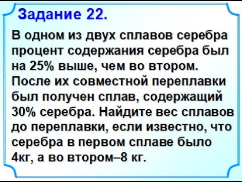 8 класс. Алгебраический способ. В одном из двух сплавов серебра процент содержания серебра был на 25% выше, чем во втором. После их совместной переплавки был получен сплав, содержащий 30% серебра. Найдите вес сплавов до переплавки, если известно, что серебра в первом сплаве было 4 кг, а во втором – 8 кг.