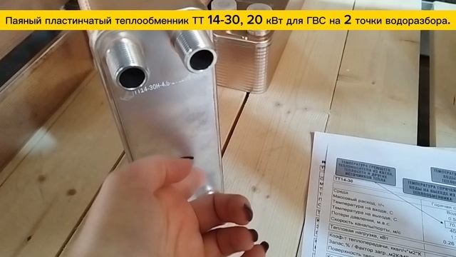 Паяный пластинчатый теплообменник ТТ14-30, мощность 20 кВт для системы ГВС на 2 точки водоразбора.