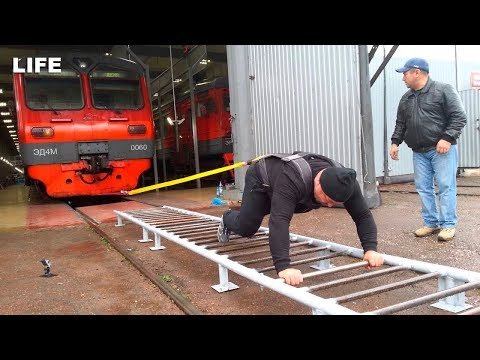Российские силачи тащат на себе поезд в Симферополе