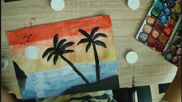 Красками рисую остров, пальмы, море и солнце
