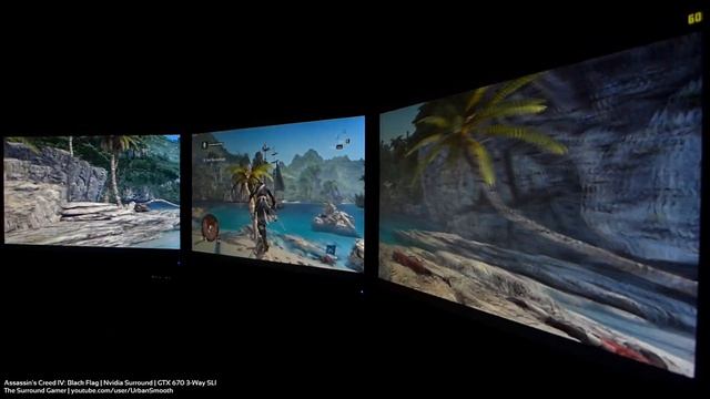 Assassin's Creed IV: Black Flag single player gameplay @ 6030 x 1200 resolution, GTX 670 3-Way SLI @ stock settings (no OC). Nvidia GeForce 331.82 WHQL driver. Sound captured via MSI Afterburner and enhanced via Audacity. Video captured via a Panasonic LUMIX DMC LX7 at 1080p and edited in Windows Movie Maker. Frames per second displayed by Fraps. AC4 is a fun game with great controls that runs smoothly and looks decent enough. I do not appreciate this game's lack of support for 16:10 resolutions, hence, the unacceptable black bars on the top and bottom of the displays. Ubisoft, please fix this enjoyable game! -- Video Guide: 0:11 - Opening Ship Battle 5:03 - Shipwreck (Lack of direct audio, sorry.) 6:18 - Island Hunt 9:29 - Island Fight Scene 11:48 - Navigating the Bay 14:14 - Havana (fighting and free running) -- Nvidia Control Panel settings: All Default save for Power management mode: Prefer maximum performance. Assassin's Creed IV video settings: •Resolution: 6030x1200 60Hz •Environment quality: Very High •Texture quality: High •Anti-Aliasing quality: FXAA •Shadow quality: Very High •Reflection quality: High •Motion blur: Off •Ambient Occlusion: HBAO+ (high) •God rays: High •Volumetric fog: On •Vsync: On -- Performance stats provided by MSI Afterburner and RealTemp: GPU Usage: GPU1 Max: 97% GPU2 Max: 97% GPU3 Max: 97% Temperatures (in a cold room): CPU Max: Estimated at 54C - 56C (Forgot to snap a pic) GPU1 Max: 35C GPU2 Max: 33C GPU3 Max: 34C VRAM Max Usage: 1990MB -- \Project\ Triple Surround Fury Build specs: CPU: i7 920 @ 4.0GHz Mobo: ASUS Rampage III Extreme RAM: Mushkin Enhanced Ridgeback 3 x 2GB DDR3 1600 6-8-6-24(1T) GPU: PNY GTX 670 3-Way SLI SSD: Crucial M4 256GB PSU: (Dual) Corsair HX1000s on separate circuits (15A and 20A) LCD: ASUS VW266H x 3 OS: Windows 7 64-Bit Case: Mountain Mods Ascension Mouse: Logitech MX518 1800 dpi Keyboard: Max Nighthawk X8 Blue Backlit Mechanical XTracPads Ripper XXL Gaming Mats Water cooling (in loop order): CPU/Mobo Loop: Swiftech MCRES v2 Laing D5 vario / MCP655 B pump XSPC RX360 radiator EK-FB R3E mobo block EK Supreme HF CPU block (plate #1) Feser UV Caribbean Blue limited edition tubing GPU loop: Swiftech MCRES v2 Laing D5 vario / MCP655 B pump XSPC RX360 radiator XSPC Razor GTX670 GPU blocks XSPC RX360 radiator -- The Surround Gamer Rage Comic: http://i.imgur.com/gMwi0V8.jpg -- Shout out to all of my subscribers!