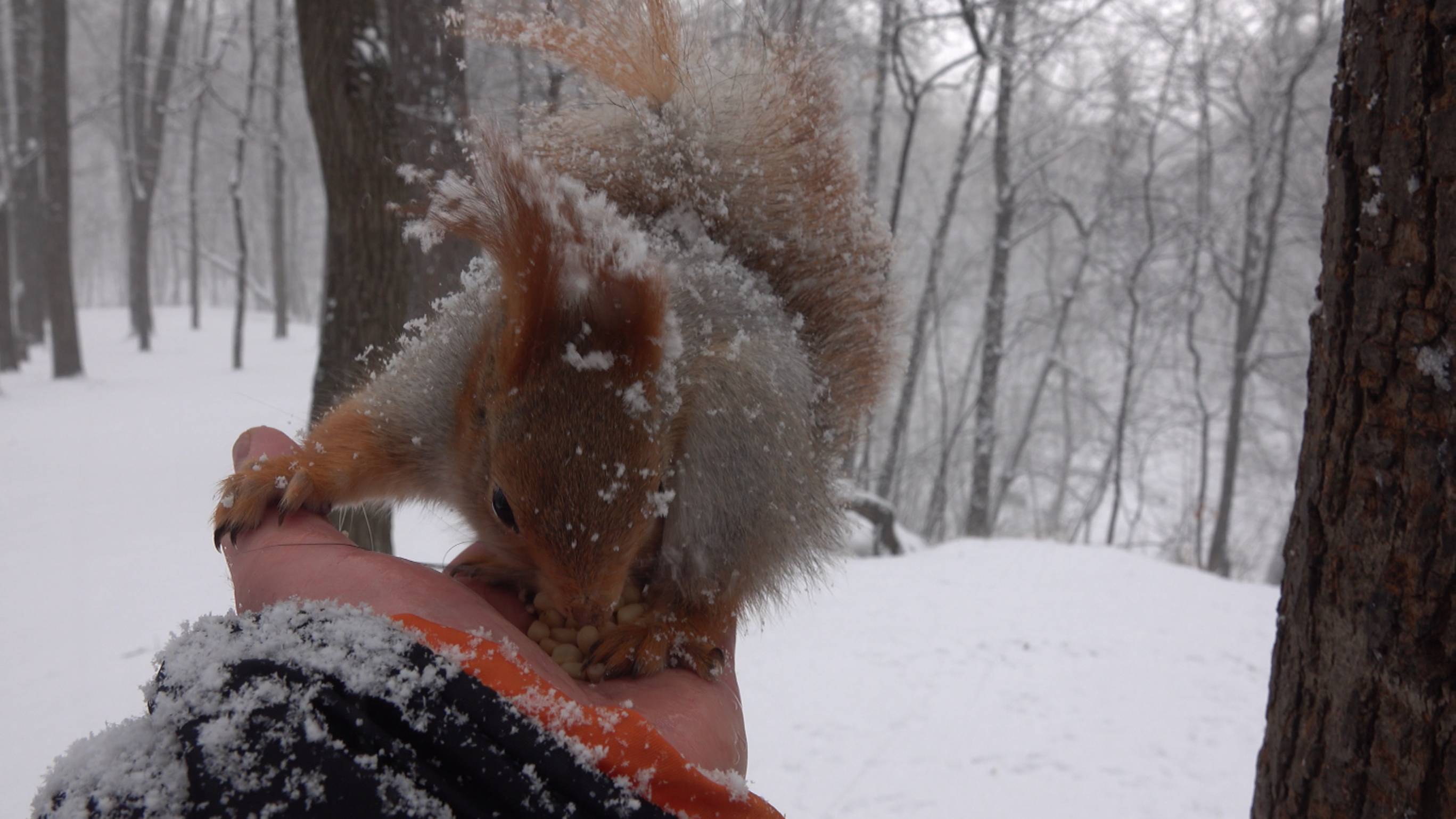 Кормлю Толстую в снегопад