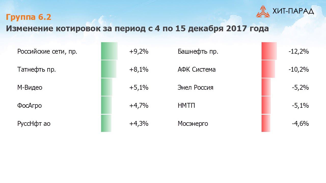 Заместитель начальника аналитического управления УК «Арсагера» Андрей Валухов в традиционном обзоре торгов на российском рынке акций «Хит-Парад» за период с 04 декабря 2017 по 15 декабря 2017 Группа 6.1 Пятерку лидеров возглавили акции Новолипецкого меткомбината, прибавившие более 9% в ожидании дивидендных выплат по итогам третьего квартала 2017 года. Бумаги Норильского Никеля выросли на 5,2% после существенного падения в предыдущем периоде. Обыкновенные акции Татнефти прибавили 4,6% после одобрения собранием акционеров решения о выплате дивидендов по итогам 9 месяцев 2017 года. Акции Новатэка и Сургутнефтегаза выросли более чем на 4% без особых корпоративных новостей. Пятерку аутсайдеров группы со снижением почти на 7% возглавили акции Полюса после выхода новостей о возможной отмене сделки с группой китайских инвесторов во главе с инвестфондом Fosun. Бумаги Мегафона и МТС показали снижение на 4% на фоне возобновления «ценовых войн» в секторе телекоммуникаций. Акции ВТБ и Алросы упали около 3% без особых корпоративных новостей. Группа 6.2 Пятерку лидеров возглавили привилегированные акции Российских сетей, выросшие более чем на 9% на фоне предстоящего утверждения нового Положения о дивидендной политике и бюджета на 2018 год. Префы Татнефти прибавили 8,1% вслед за обыкновенными акциями компании. Акции Фосагро подорожали на 4,7% на фоне новостей о потенциальном снижении экспорта удобрений китайскими производителями по причине изменения налоговой системы, что оказывает положительное влияние на глобальные рынки. Бумаги РуссНефти и М.Видео выросли на 4,3% и 5,1% соответственно без особых корпоративных новостей. Пятерку аутсайдеров группы возглавили префы Башнефти, прошедшие отсечку под дивидендные выплаты. Акции АФК Системы потеряли 10,2% на фоне взаимного обмена судебными претензиями с Роснефтью. Кроме того, компании не удалось продать пакет акций Детского мира. Бумаги Энел Россия снизились на 5,2% из-за судебного иска Prosperity Capital Management против материнской компании Энел Россия - Enel Investment Holding. Prosperity требует выплатить в пользу Энел Россия 8,1 млрд руб., потраченных на покупку парогазовой турбины мощностью 440 МВт для Среднеуральской ГРЭС. Prosperity заявляет, что турбина была куплена с нарушением российского законодательства, поскольку сделка, которая является сделкой с заинтересованностью, была одобрена только советом директоров, и не была вынесена на рассмотрение собранием акционеров. Акции Новороссийского морского торгового порта снизились на 5,1% после выхода довольно слабой отчетности за 9 месяцев 2017 года. Бумаги Мосэнерго показали снижение на 4,6% без особых корпоративных новостей. Группа 6.3 Пятерку лидеров возглавили акции САФМАР Финансовые инвестиции, прибавившие более 10% в ожидании промежуточных дивидендных выплат. Бумаги ТрансКонтейнера выросли на 5,2% после закрытия сделки по продаже 24,5% акций компании - структуре Романа Абрамовича и Александра Абрамова. Акции Новороссийского комбината хлебопродуктов прибавили 5,1% на фоне приближения отсечки под дивидендные выплаты. Обыкновенные акции Лензолото и Нижнекамскнефтехима выросли на 3,9% и 4,8% соответственно без особых корпоративных событий. Пятерку аутсайдеров возглавили акции Промсвязьбанка, потерявшие почти 13% на фоне введения временной администрации Банком России. Бумаги ПРОТЕКа упали на 7% пос