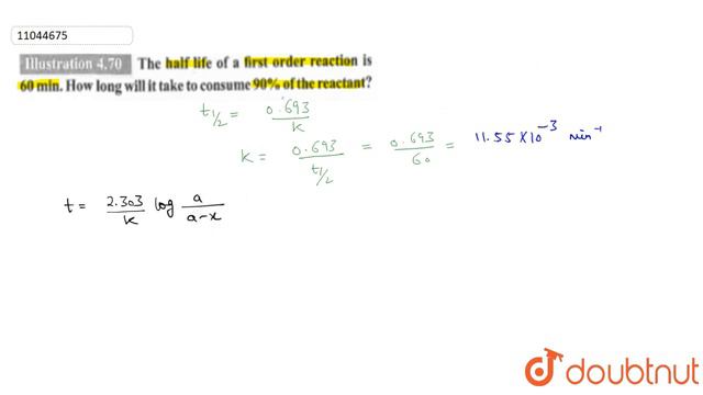 The half life of a first order reaction is `60 min`. How long will is take to consume `90%` of t...