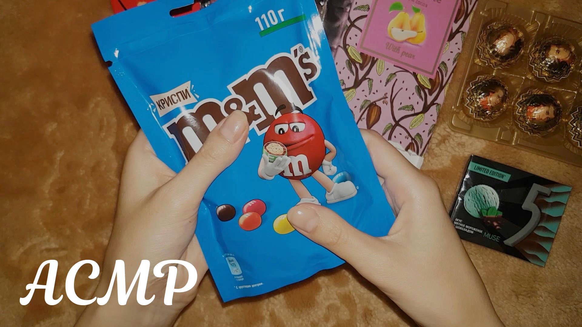 Привет, в этом АСМР видео я буду шуршать конфетами и шоколадом, понемножку всё пробовать, а также жевать жвачку. Осторожно, здесь есть итинг и звуки рта! Звуки распаковки и тихий голос для расслабления и сна.