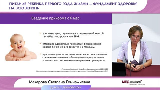23 июня 2022 г. в 17:00 состоится вебинар на тему: «Питание ребенка первого года жизни – фундамент здоровья на всю жизнь» Научный руководитель: Макарова Светлана Геннадиевна - д.м.н., заведующая отделом профилактической педиатрии ФГАУ Министерства здравоохранения Российской Федерации «Национальный медицинский исследовательский Центр Здоровья Детей», Главный внештатный детский специалист по профилактической медицине МЗ РФ по ЦФО. Вебинар посвящен фундаментальным основам детского питания. Будут рассмотрены все базовые принципы организации питания, начиная с рациона беременных и кормящих женщин. Подробно будут обсуждаться преимущества грудного вскармливания, современные подходы к введению прикорма. Мероприятие аккредитовано в совете НМО для специальностей: гастроэнтерология, общая врачебная практика (семейная медицина), педиатрия. Критерии получения баллов НМО: Регистрация пользователя на сайте; Обязательное подтверждение своего присутствия во всплывающем окне «Продолжить просмотр», из расчета 1 всплывающее окно в течение 45 минут. Время появления окна рандомно; Просмотр конференции в режиме онлайн не менее 45 минут научно-практической части, минимум 1 окон из 2 возможных; Коды НМО приходят в ваш личный кабинет в течение 1-2 недель после мероприятия, это связано с большой технической загрузкой МедЗнания и Координационного Совета НМО МЗ РФ; Коды НМО не имеют ограничения по времени. Слушатели смогут задать вопросы лектору в чате трансляции. Участие для слушателей бесплатно. Присоединяйтесь!