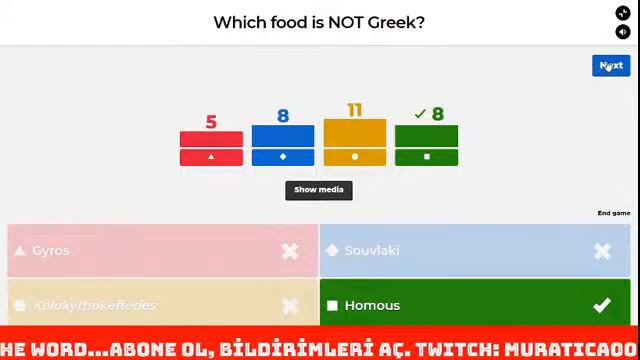 FOR TIPS, TIP ME! : https://streamlabs.com/muratica00/tip Amazon Affiliate Links for the Product: https://amzn.to/2B1uVIy It is all about International Food and Grammar, and all in English. We are testing our knowledge with 25 questions live about the last update of the game. Enjoy the Kahoot! game with joining us!... English grammar competition on Kahoot!.... I will be waiting for you every day at 4pm and every night between 8-10pm (TCT- Turkish Central Time-GMT+2) Check your time on https://bit.ly/34n8msa Bizimle Kahoot! oynamaya ne dersiniz? Her akşam 20.00-22.00 arası sizleri de kanalıma bekliyorum... Abone olmayı ve bildirimleri açmayı unutmayın...