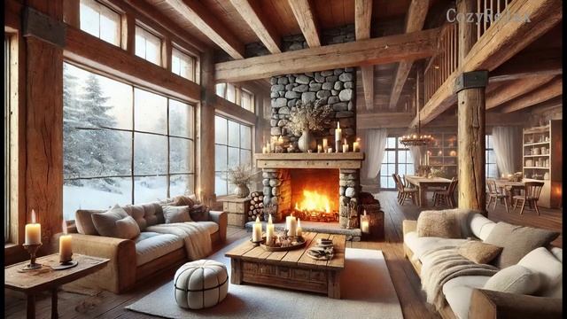 Уютное и расслабляющее пребывание в деревянной хижине, наслаждаясь успокаивающими звуками потрескивающего камина, пока снаружи мягко падает снег.