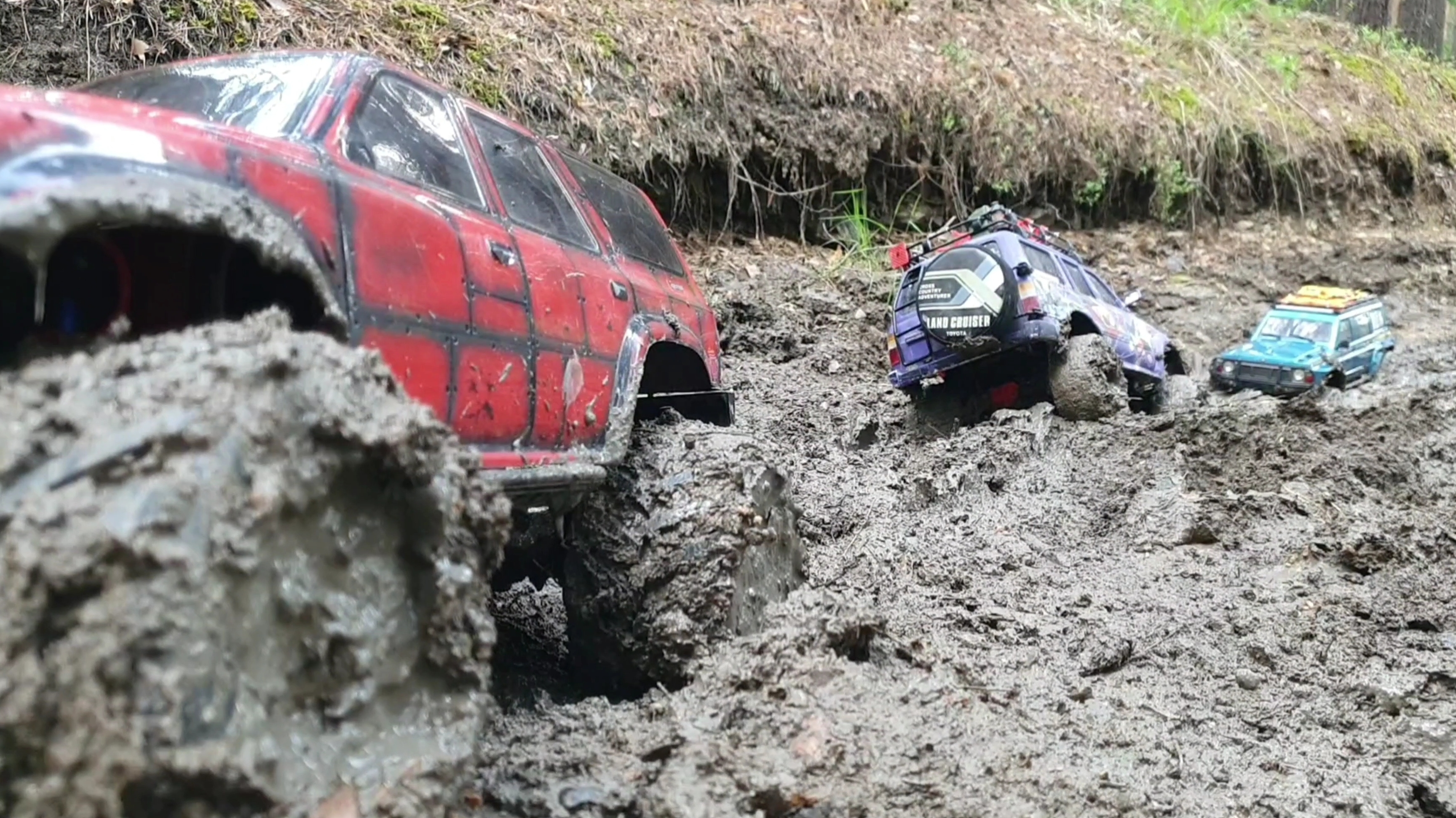 В этом видео смельчаки на радиоуправляемых машинах 4×4 преодолевают препятствие из очень густой грязи. В итоге пришлось использовать трос и лебёдку.