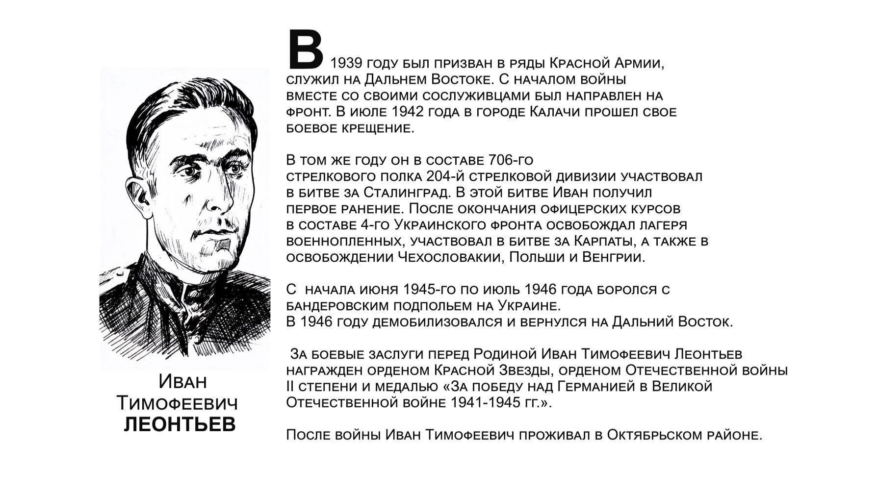 В годы Великой Отечественной войны на фронт ушли более 11 тысяч жителей ЕАО, семь тысяч наших земляков погибли или пропали без вести. Те, кто вернулись, прожили достойную жизнь. Они строили дома, выращивали хлеб, учили детей, стояли на охране правопорядка. Этим людям мы посвящаем нашу галерею "Бессмертный взвод". Среди героев - Иван Тимофеевич ЛЕОНТЬЕВ.