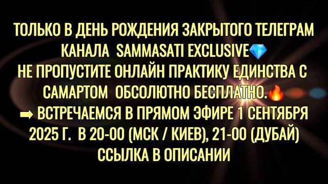 Дорогие ❤ Для нашей команды очень волнительный и счастливый момент Ровно 1 Год назад - 1 сентября мы создали закрытый канал "Sammasati Exclusive " Сегодня нас там больше 2000 участников За что мы благодарны каждому из вас Целый год мы вместе идем к вашим изменениям, читаем ваши истории, наслаждаемся вашими успехами и понимаем: Мы на правильном пути! Здесь наше место! Здесь мы нужны ❤ В честь этого события мы хотим пригласить каждого желающего, а вы в свою очередь, можете пригласить своих желающих на СОВМЕСТНУЮ ПРАКТИКУ из Закрытого канала с Самартом, которая пройдет в Прямом эфире и будет открыта для каждого, кому это необходимо ❤ ➡️ Встречаемся в Прямом эфире 1 сентября 2025 г. в 20-00 (Мск / Киев), 21-00 (Дубай) Сначала Самарт поотвечает на вопросы, саму практику начнем в 20-40 (мск) Ссылкa для входа https://youtube.com/live/18BUXgRtn9A?feature=share Присоединяйтесь ❤️