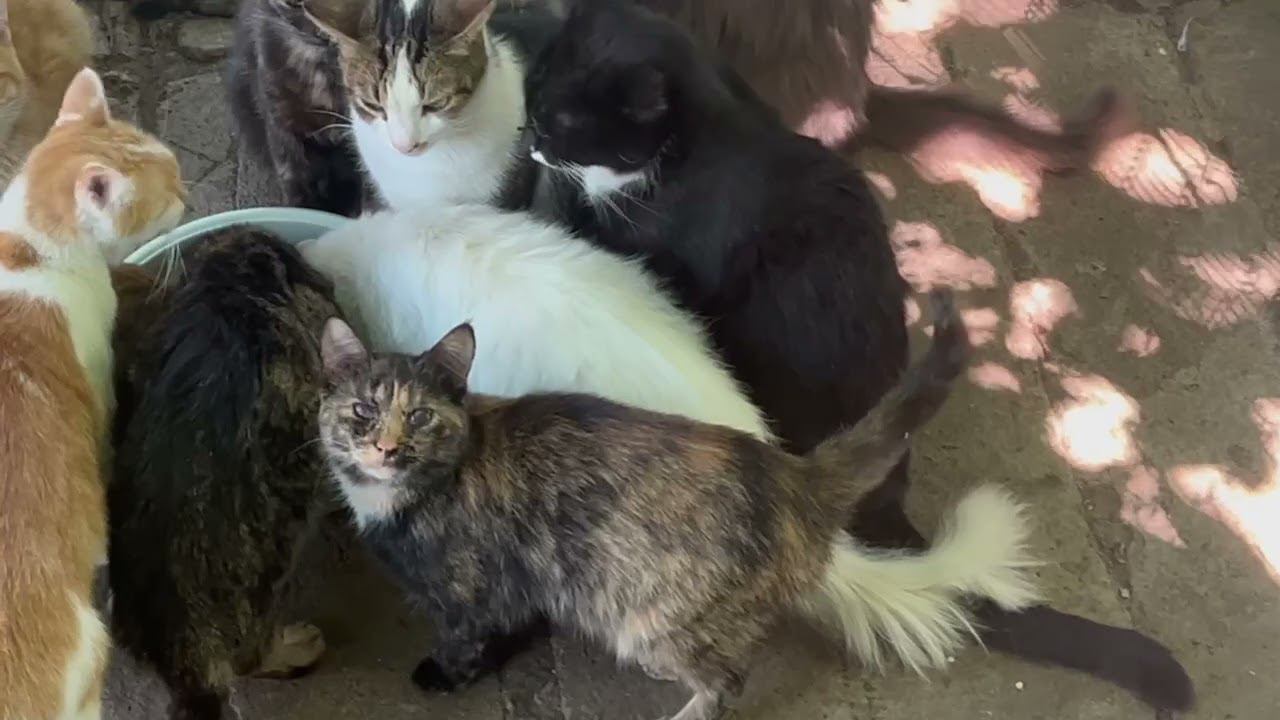 Котики в летнем вольере ждут перекус