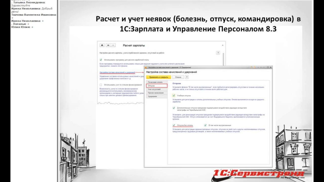 a) Командировки работников b) Отпуска и их оплата c) Начисления отпускных, командировочных и прочих выплат за неотработанное время d) Учет неявок по различным причинам в программе «1С:Зарплата и управление персоналом 8» (ред. 3.0) e) Настройка, учет и расчет в программе отпусков (основного и дополнительных)