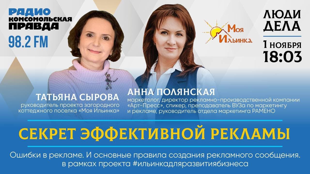 Секретами эффективной рекламы поделимся в рамках проекта #ильинкадлябизнеса. Ждем в гости на радиостанцию «Комсомольская правда в Самаре» Татьяну Сырову, руководителя проекта загородного коттеджного поселка «Моя Ильинка», и Анну Полянскую, маркетолога, директора рекламно-производственной компании «Арт-Пресс». Ведущий: Александр Сёмочкин. Слушайте и смотрите радио «Комсомольская правда в Самаре». Новости, трансляции, интересные факты. Телефон прямого эфира: 379-39-39! Архив программ и эфиры в виде подкастов можно также слушать - в нашей группа во «ВКонтакте» https://vk.com/radiokp63 - на сайте https://radiokp.ru/samara #самара