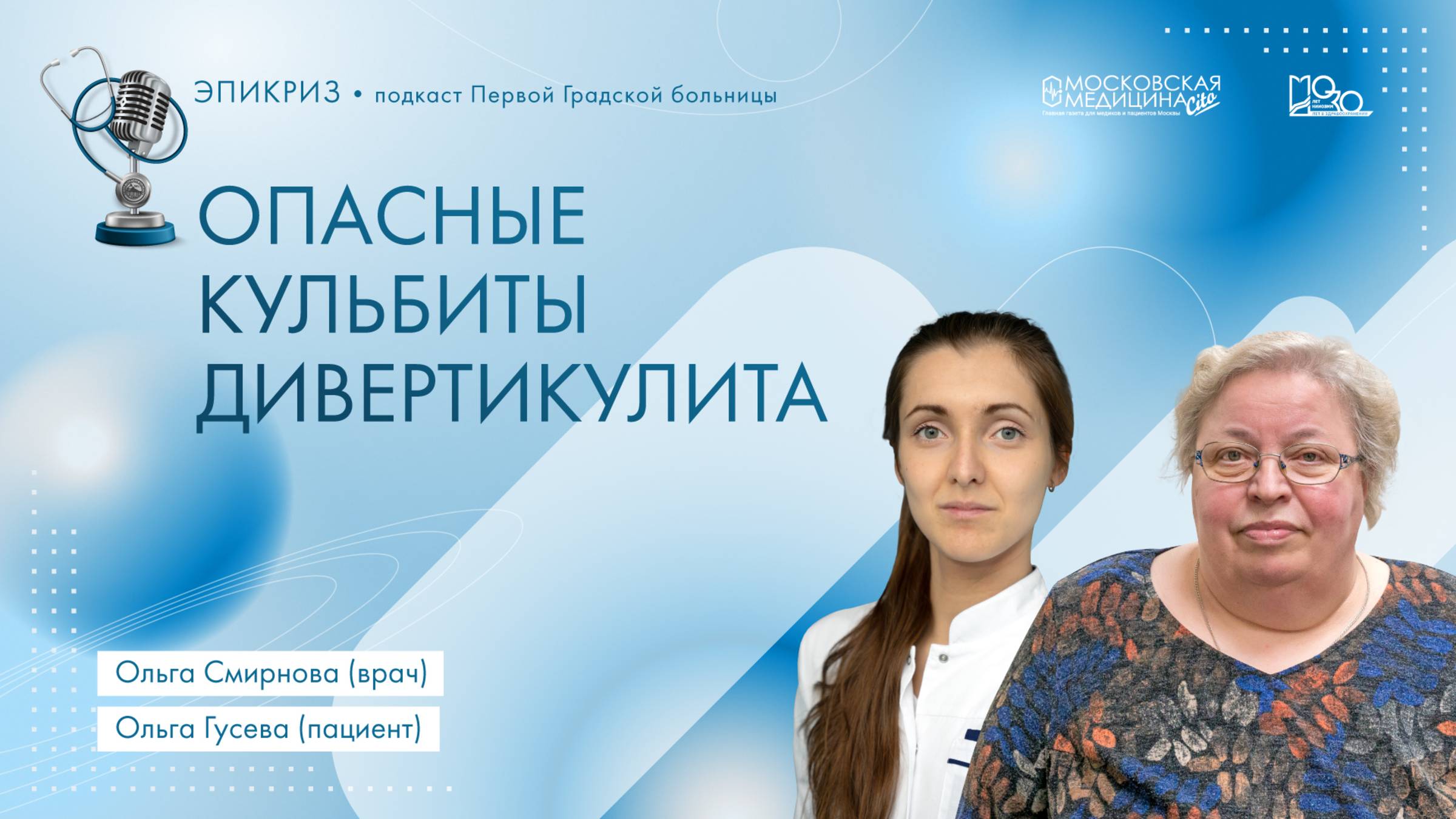 🔝17-й выпуск подкаста Первой Градской #Эпикриз мы решили посвятить дивертикулиту – воспалительному заболеванию кишечника, которое может привести к очень серьезным последствиям. Пациентку Первой Градской Ольгу Николаевну Гусеву обострение этой болезни привело к экстренной операции и к установке стомы, с которой она вынуждена была ходить несколько месяцев. 🔊 К счастью, самое страшное уже позади, и Ольга Николаевна готова рассказать о пережитом вместе со своим лечащим врачом – хирургом 2-го хирургического отделения Первой Градской Ольгой Алексеевной Смирновой. 🎙Модератор в студии НИИОЗММ руководитель пресс-службы Первой Градской Татьяна Гурьянова.