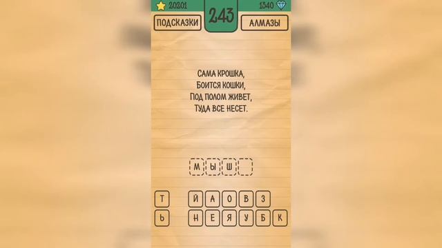 Как пройти Загадки Ребусы Шарады, ответы, решение раздел Загадка Уровень 243 Сама крошка, боится кошки, под полом живёт, туда всё несёт. Привет, ребята! Пожалуйста, поддержите канал лайком ? и подпиской ? Напишите, какие игры вам ещё интересны. И я постараюсь пройти их для вас ?