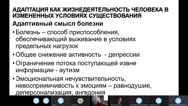 1. 00:11 Курпатов Владимир Иванович, Посохова С.Т, Завьялова Е.К, Овчинников Б.В. Курпатов В.И. - врач психиатр, психотерапевт, сексолог, доктор медицинских наук, профессор. Президент Профессиональной Медицинской Психотерапевтической Ассоциации (ПМПА). Член Правления Российского Общества Психиатров, действительный член Петровской академии наук и искусств, профессор Санкт-Петербургского Медико-Социального института, руководитель Центра Психотерапии и Психосоматики многопрофильной клиники «РеаСанМед». Доклад: "Вклад А.Л. Зюбана в психотерапию, в военную психиатрию, в психофармакологию здорового человека в экстремальных условиях". 2. 19:13 Решетников Михаил Михайлович, доктор психологических наук, кандидат медицинских наук, профессор, Заслуженный деятель науки РФ, ректор Восточно-Европейского института психоанализа, президент Европейской Конфедерации Психоаналитической Психотерапии. Доклад: Памяти профессора А.Л.Зюбана». С полным выступлением М.М.Решетникова можно ознакомиться по ссылке: https://www.youtube.com/watch?v=P9PgrmGVHlA 3. 21:24 Овчинников Борис Владимирович, начальник научно-исследовательской лаборатории (профессионального психического здоровья), научно-исследовательского отдела (медико-психологического сопровождения), научно-исследовательского центра Военно-медицинской академии имени С. М. Кирова, доктор медицинских наук, профессор, член-корреспондент Академии военных наук РФ, лауреат Государственной премии СССР. Доклад: «Медико-психологическое сопровождение персонала закрытых организаций: ближайшие перспективы совершенствования». 4. 53:56 Посохова Светлана Тимофеевна, доктор психологических наук, профессор, Санкт-Петербургский государственный университет. Завьялова Елена Кирилловна, доктор психологических наук, профессор, заведующая кафедрой Высшая школа менеджмента, Санкт-Петербургский государственный университет. Доклад: «Личностные адаптационные феномены в изменяющейся социокультурной реальности». 5. 1:32:30 Обсуждение докладов.
