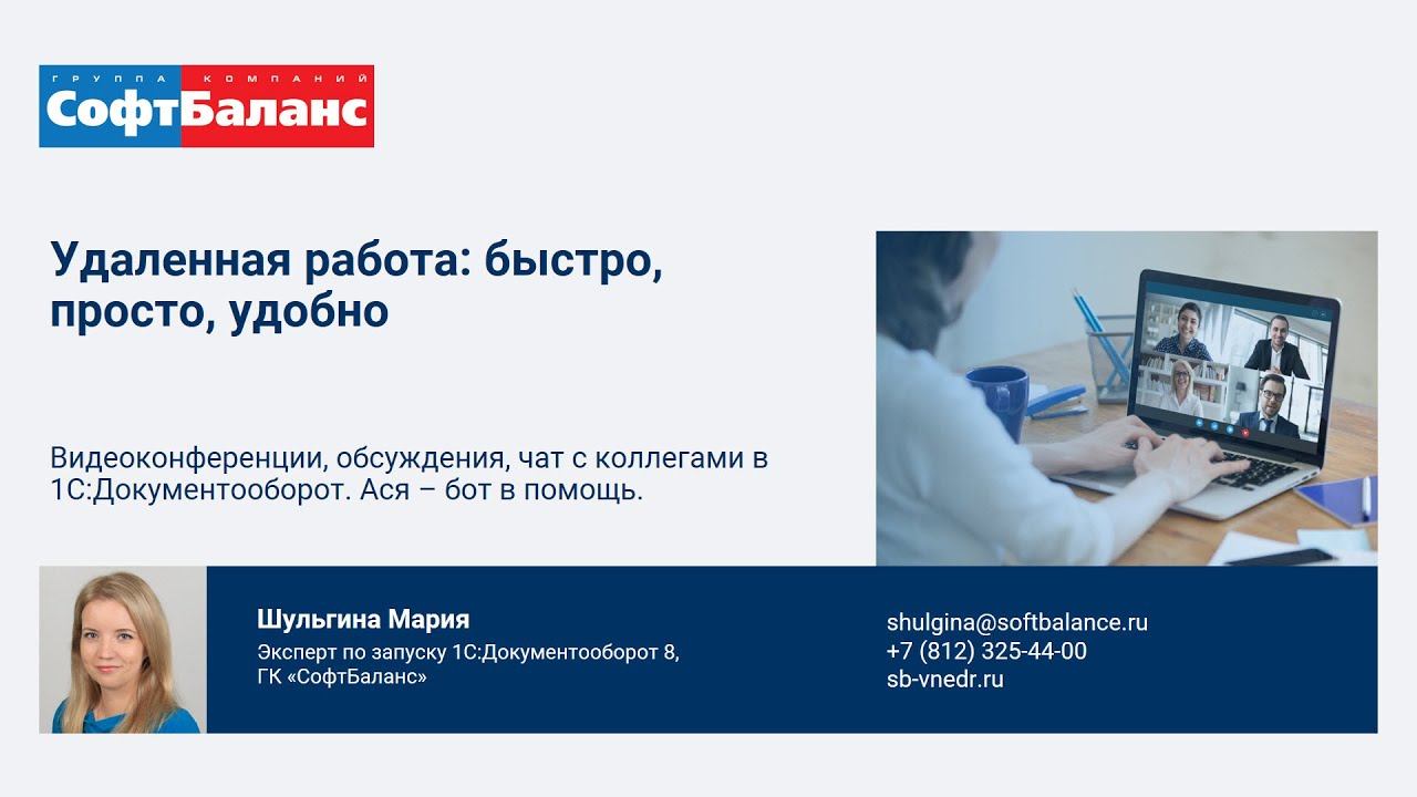 ГК "СофтБаланс" https://sb-vnedr.ru/ Удаленная работа: быстро, просто, удобно. Демонстрация в программе 1С. Организация видеоконференций в 1С:Документооборот; Обсуждения документов, чат с коллегами; Ася – бот в помощь. Внедрение и типовой запуск 1С:Документооборот: https://sb-vnedr.ru/programm/1c-dokumentooborot-vnedrenie/ Получать приглашения на бесплатные мероприятия https://sb-vnedr.ru/about/meropriyatiya/subscribe/ https://youtu.be/-l8OomOuomw