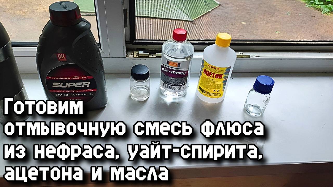 Готовим отмывочную смесь флюса из нефраса, уайт-спирита, ацетона и масла.