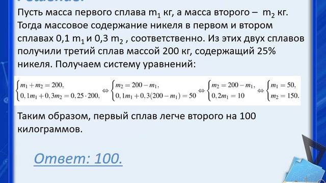 Решение задач из сборников ЕГЭ по математике, профиль, текстовые задачи (сплавы)