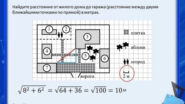 Демонстрационный вариант контрольных измерительных материалов основного государственного экзамена 2023 года по МАТЕМАТИКЕ Прочитайте внимательно текст и выполните задания 1–5 На плане изображено домохозяйство по адресу: с. Авдеево, 3-й Поперечный пер., д. 13 (сторона каждой клетки на плане равна 2 м). Участок имеет прямоугольную форму. Выезд и въезд осуществляются через единственные ворота. При входе на участок справа от ворот находится баня, а слева — гараж, отмеченный на плане цифрой 7. Площадь, занятая гаражом, равна 32 кв. м. Жилой дом находится в глубине территории. Помимо гаража, жилого дома и бани, на участке имеется сарай (подсобное помещение), расположенный рядом с гаражом, и теплица, построенная на территории огорода (огород отмечен цифрой 2). Перед жилым домом имеются яблоневые посадки. Все дорожки внутри участка имеют ширину 1 м и вымощены тротуарной плиткой размером 1 м × 1м . Между баней и гаражом имеется площадка площадью 64 кв. м, вымощенная такой же плиткой. К домохозяйству подведено электричество. Имеется магистральное газоснабжение. Для объектов, указанных в таблице, определите, какими цифрами они обозначены на плане. Заполните таблицу, в бланк ответов перенесите последовательность четырёх цифр. Тротуарная плитка продаётся в упаковках по 4 штуки. Сколько упаковок плитки понадобилось купить, чтобы выложить все дорожки и площадку перед гаражом? Найдите площадь, которую занимает жилой дом. Ответ дайте в квадратных метрах. Найдите расстояние от жилого дома до гаража (расстояние между двумя ближайшими точками по прямой) в метрах. Хозяин участка планирует устроить в жилом доме зимнее отопление. Он рассматривает два варианта: электрическое или газовое отопление. Цены на оборудование и стоимость его установки, данные о расходе газа, электроэнергии и их стоимости даны в таблице. Обдумав оба варианта, хозяин решил установить газовое оборудование. Через сколько часов непрерывной работы отопления экономия от использования газа вместо электричества компенсирует разность в стоимости установки газового и электрического отопления? Найдите значение выражения: ¼+ 0,07 На координатной прямой отмечена точка А. Известно, что она соответствует одному из четырёх указанных ниже чисел. Какому из чисел соответствует точка А? Найдите значение выражения при a = 5. Решите уравнение х2 + х - 12=0. Если уравнение имеет более одного корня, в ответ запишите больший из корней. На тарелке лежат пирожки, одинаковые на вид: 4 с мясом, 8 с капустой и 3 с яблоками. Петя наугад выбирает один пирожок. Найдите вероятность того, что пирожок окажется с яблоками.