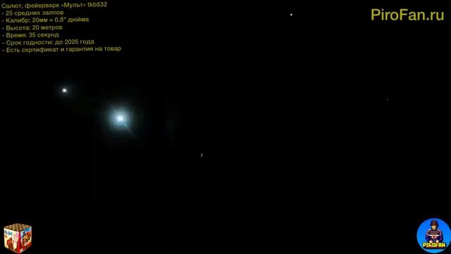 Салют, фейерверк Tkb532 “Мульт" в PiroFan.ru - 25 средних залпов - Калибр: 20мм = 0,8" дюйма - Время действия салюта: 35 секунд - Высота эффектов: 20 метров - Срок годности до 2026 года - Есть сертификат и гарантия на товар Магазин: https://www.PiroFan.ru Магазин VK: https://www.vk.com/PiroFan Instagram: https://www.Instagram.com/pirofan_ru Whats App: https://www.wa.me/79636131693 - Уточнить наличие/Заказать/Полная консультация профессионалов + 7 963 613-16-93 - Наш адрес: Москва, Метро Новогиреево, Саянская 11 корпус 1 - Осуществляем доставку по всей России