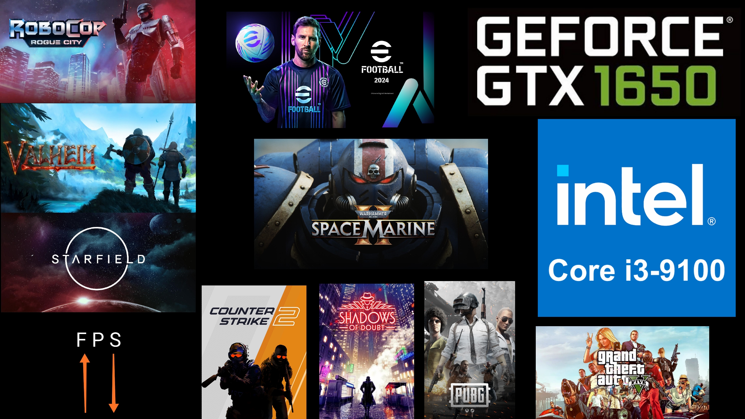 i3 9100 + GTX 1650 vs Space Marine, Starfield, Shadows of Doubt, PUBG, RoboCop,CS2,Football 2024 fps