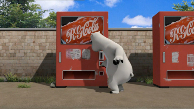 Белый медвежонок пытается побороть автомат по продаже прохладительных напитков:)