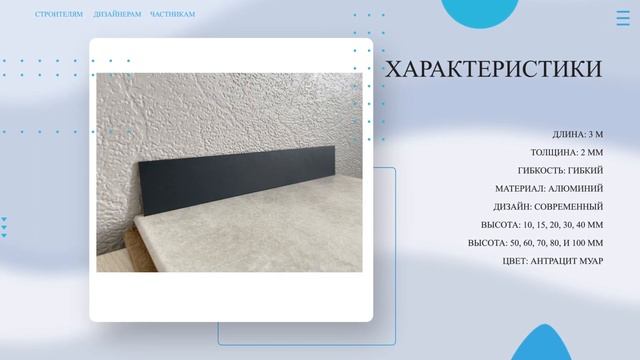 Официальный магазин завода Производителя: https://alyuminievyjplintus.ru/ Купить ПЛИНТУС ПОЛОСА АЛЮМИНИЕВАЯ АНТРАЦИТ МУАР: https://alyuminievyjplintus.ru/item/plintus-polosa-aljuminievaja-10-mm-antracit-muar Л-образный плинтус из алюминия высотой 60 мм. находит отличное применение при отделке помещений в стиле Premium, Hi-Tech или Минимализм. Так же довольно часто используется в интерьерах автосалонов и бизнес-центров. Плинтус имеет привлекательный дизайн, отличное качество, а в совокупности более привлекательной ценой, по сравнению и зарубежными аналогами. Возможна окраска в различные цвета по RAL. Для плинтусов есть комплектующие из ПВХ и из алюминия. В ролике вы увидите: ▶ ПЛИНТУС ПОЛОСА АЛЮМИНИЕВАЯ АНТРАЦИТ МУАР ▶ Стоимость, скидки и характеристики Тайминг: 00:00 Вступление 00:06 Описание и цена 00:14 Характеристики 00:20 Дополнительная информация (Доставка, Оплата, Скидки, Обмен, Возврат) 00:30 Магазин завода производителя Характеристики: ДЛИНА: 3 М ТОЛЩИНА: 2 ММ ГИБКОСТЬ: ГИБКИЙ МАТЕРИАЛ: АЛЮМИНИЙ ДИЗАЙН: СОВРЕМЕННЫЙ ВЫСОТА: 10, 15, 20, 30, 40 ММ ВЫСОТА: 50, 60, 70, 80, И 100 ММ ЦВЕТ: АНТРАЦИТ МУАР Интересные ролики про плинтус: Плинтус алюминиевый 80х10 черный матовый https://youtu.be/oHVCEHSvDDU?si=-nQi4ewE5WfC9qJC Плинтус алюминиевый 60х11 светлая бронза https://youtu.be/ihlQM3PwBrM?si=VpfARSQvz4sh0oqf Плинтус алюминиевый 60х11 светлая бронза https://youtu.be/rhH4Uc98YVw?si=99Vh79yKL0WjI38Z Подписывайтесь на наш канал, следите за новыми полезными роликами, пишите комментарии и приятного просмотра! Сайт: https://alyuminievyjplintus.ru/ #плинтус #плинтусполоса #алюминиевыйплинтус #напольныйплинтус #плинтуслобразный