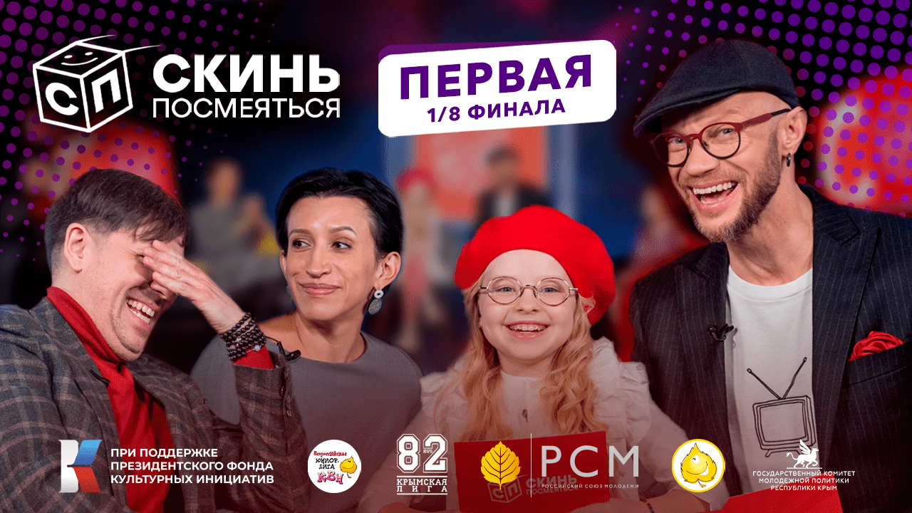 Первая 1/8 финала Чемпионата второго сезона Международной детской онлайн-лиги КВН «Скинь посмеяться!» ВЕДУЩИЕ: — Дмитрий Хрусталёв — Ева Смирнова ЖЮРИ: — Евгений Донских и его сын Пётр Донских — Елена Борщева и её дочь Ума Юшкевич КОМАНДЫ ВЫПУСКА: 1. «Сила юности», г. Москва. 2. «Компот», г. Челябинск. 3. «Халва», Ярославская обл., п. Константиновский. 4. «Теория Заговора Школ», г. Киров. 5. «Жить здорово», г. Псков. 6. «ШпОна», Приморский край, п. Новый. Организаторы проекта: — Президентский фонд культурных инициатив — Всероссийская Юниор-Лига КВН — РОО «КРЫМСКАЯ МОЛОДЕЖНАЯ ЛИГА КВН» Партнёры проекта: — Российский союз молодёжи — Государственный комитет молодёжной политики Республики Крым VK — vk.com/sendjoke TG — t.me/sendjoke ТАЙМКОДЫ 5:15 - Сила юности 11:20 - Компот 17:11 - Халва 22:40 - Жить здорово 27:20 - Теория заговора школ 33:20 - Шпона