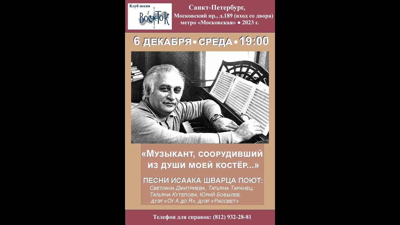 «Музыкант, соорудивший из души моей костёр...». Песни Исаака Шварца поют: Татьяна Таранец, дуэт «От А до Я»: Елена Адрианова и Игорь Яковлев, Светлана Дмитриева, Татьяна Кутепова и Юрий Бобылев, дуэт «Рассвет»: Светлана Широва и Юлиан Афанасьев. Клуб песни «Восток». 6 декабря 2023 г. Ведущая - Светлана Широва. Санкт-Петербург, Московский пр., д. 189. Видеозапись - Алла Левитан. Запись звука - Алексей Холмецкий. Афиша - Лев Мильчин.