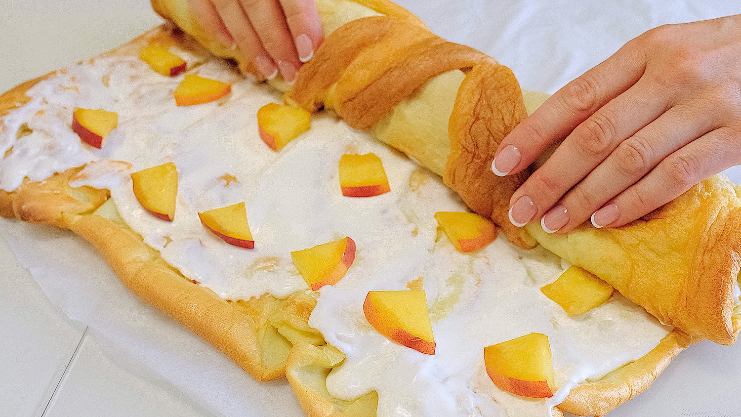 Яйца (4 шт). Сахар (1 ст л). Щепотка соли. Мука (180 г). Молоко ? (400 мл). Растопить сливочное масло ? (20 г). Накройте и оставьте на 10 минут. Выпекать при 190°С / 374°F 25-30 минут. Сливки 33% (100 мл) + сливочный сыр (100 г). Сахарная пудра (1 ст л). Персик ? (1 шт).