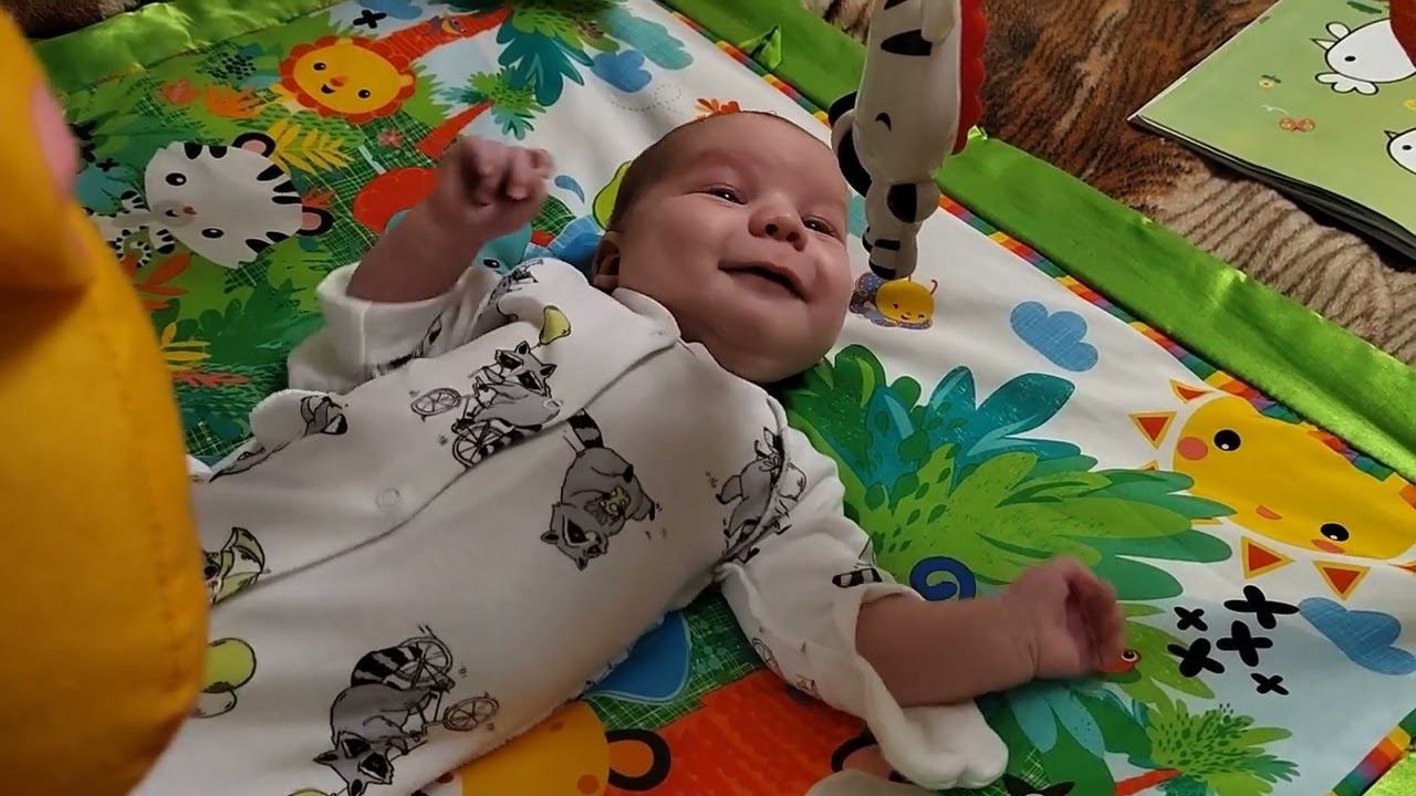 Мирончик активно гулит, жуёт кулак и держит игрушку, малышу 2 месяца и 1 неделя.