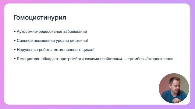 Знакомьтесь, гомоцистеин – аминокислота, обладающая выраженным тромбогенным потенциалом. Ее уровень в нашем организме зависит от хрупкого баланса в метиониновом цикле. Всего один сбой – и запускается цепь событий, ведущих к тяжелым патологиям. Почему пациенты с гомоцистинурией внешне так похожи на людей с синдромом Марфана, но имеют высокий риск тромбозов? Как отличить эти состояния от цистинурии? И при чем здесь дефицит витаминов B6, B12 и фолата? Об этом и многом другом расскажет преподаватель SYNAPSE Александр Бусанкин в новом видео. Чтобы так же легко разбираться в сложных биохимических связях на экзамене USMLE Step 1, приходите на наш курс подготовки. Мы учим не «зубрить», а понимать логику процессов. И никакой воды Только системный подход, разбор клинических кейсов и постоянная поддержка преподавателей. Готовы заложить прочный фундамент для своей медицинской карьеры? Присоединяйтесь! https://synapse-med.ru/usmle