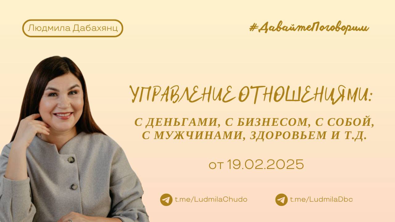 Рубрика #ДавайтеПоговорим от 19.02.2025 Управление отношениями: с деньгами, с бизнесом, с собой, с мужчинами, здоровьем и т.д. 💫записи прошлых разборов здесь 👉🏻 https://rutube.ru/plst/364320 ‼️ ВАЖНО: Уже в марте старт обучения работе с метафорическими картами. В основе обучения - метод вселенской терапии Л. Тальписа. Заходите в бот - https://t.me/ludmiladbc_bot и пишите "МАК", если хотите участвовать ‼️ канал #твАрец_реальности 2025 Подробнее: https://rutube.ru/video/2744940f7bab3063b818c926b2253dfc/ О канале: https://t.me/chatLudmilaChudo/4310 Заходите в бот - https://t.me/ludmiladbc_bot , если хотите участвовать Теперь в одном месте ты можешь посмотреть: ✔️ чем я могу быть для тебя и... ✔️ что я могу дать тебе Переходи: https://t.me/ludmiladbc_bot ✓ Обязательно поставь 💗 ✓ Подпишись на канал ✓ И поделись с близкими Это будет вашим балансом за движение и получение энергии. Если есть желание создать баланс брать-давать... приму от всего сердца с благословением (донейшн). С Огромной Любовью, Дабахянц Людмила 💓 ✨ Telegram: https://t.me/ludmiladbc ✨ Канал в telegram “Я ЕСТЬ”: https://t.me/LudmilaChudo ✨Онлайн-школа: https://ludmilachudo.skillspace.ru/school ✨Rutube: https://rutube.ru/channel/34371568/
