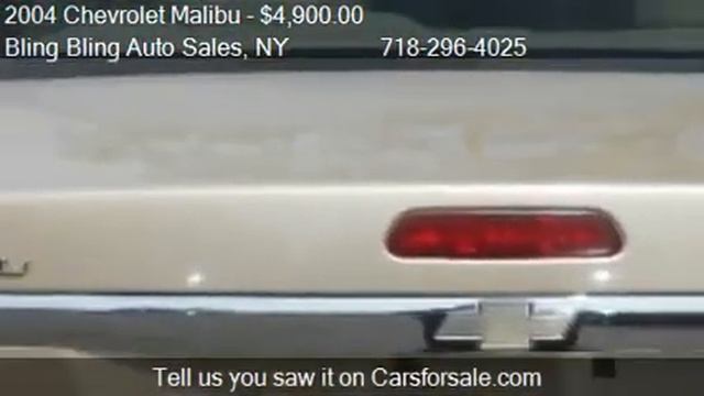 Bling Bling Auto Sales 8020 Rockaway Blvd in Ozone Park, NY 11416 Come test drive this 2004 Chevrolet Malibu LS for sale in Ozone Park, NY. http://www.blingblingautos.com There are no electrical concerns associated with this vehicle. No defects. There are no dings on this vehicle. This vehicle is in good running condition. The condition of exterior is extra clean. The exterior condition of this vehicle shows that it was garaged. This vehicle was owned by a non-smoker. The interior has been meticulously kept. Actual miles. The transmission shifts like it was new. There are no signs of prior damage on this vehicle. This vehicles tires are only slightly worn with 75% of tread life left. This vehicle also includes a 6 month / 6,000 miles warranty!! Please feel free to call and ask for Anthony at (718) 296-4025 or come visit us at 80-20 Rockaway Blvd Ozone Park, NY 11416 and see this beautiful Malibu LS Option List:ABS Brakes,Adjustable Foot Pedals,Air Conditioning,Alloy Wheels,AM/FM Radio,Anti-Brake System: 4-Wheel ABS,Automatic Headlights,Body Style: SEDAN 4-DR,Cargo Net,Cargo Volume: 15.40 cu.ft.,CD Player,Child Safety Door Locks,Cruise Control,Curb Weight-automatic: 3297 lbs,Daytime Running Lights,Driver Airbag,Driver Multi-Adjustable Power Seat,Engine Type: 3.5L V6 OHV 12V,Front Air Dam,Front Brake Type: Disc,Front Headroom: 39.90 in.,Front Hip Room: 52.40 in.,Front Legroom: 41.90 in.,Front Shoulder Room: 56.70 in.,Front Spring Type: Coil,Front Suspension: Ind,Fuel Economy-city: 23 miles/gallon,Fuel Economy-highway: 32 miles/gallon,Ground Clearance: 6.10 in.,Interval Wipers,Keyless Entry,Maximum Towing: 1000 lbs,Overall Height: 57.50 in.,Overall Length: 188.30 in.,Overall Width: 69.90 in.,Passenger Airbag,Passenger Volume: 101.40 cu.ft.,Power Adjustable Exterior Mirror,Power Door Locks,Power Windows,Rear Brake Type: Disc,Rear Headroom: 37.60 in.,Rear Hip Room: 52.00 in.,Rear Legroom: 38.50 in.,Rear Shoulder Room: 56.10 in.,Rear Spring Type: Coil,Rear Suspension: Ind,Rear Window Defogger,Second Row Folding Seat,Standard Seating: 5,Standard Towing: 1000 lbs,Steering Type: RandP,Steering Wheel Mounted Controls,Tachometer,Tank: 16.60 gallon,Telescopic Steering Column,Tilt Steering,Tilt Steering Column,Tires: 205/65R15,Track Front: 60.00 in.,Track Rear: 59.30 in.,Traction Control,Trunk Anti-Trap Device,Turning Diameter: 38.00 in.,Vehicle Anti-Theft,Wheelbase: 106.30 in. Provided by Carsforsale.com http://video.carsforsale.com/vehiclevideo.aspx?vid=190536306