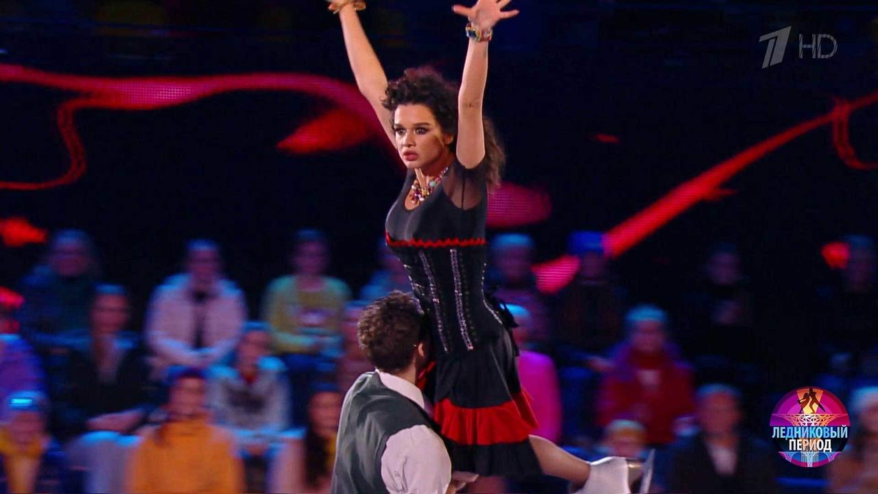 На льду — телеведущая Ксения Бородина и олимпийский чемпион Дмитрий Соловьев. Пара танцует под песню «Black Magic Woman» в исполнении Лилы Даунс и Рауля Мидона.