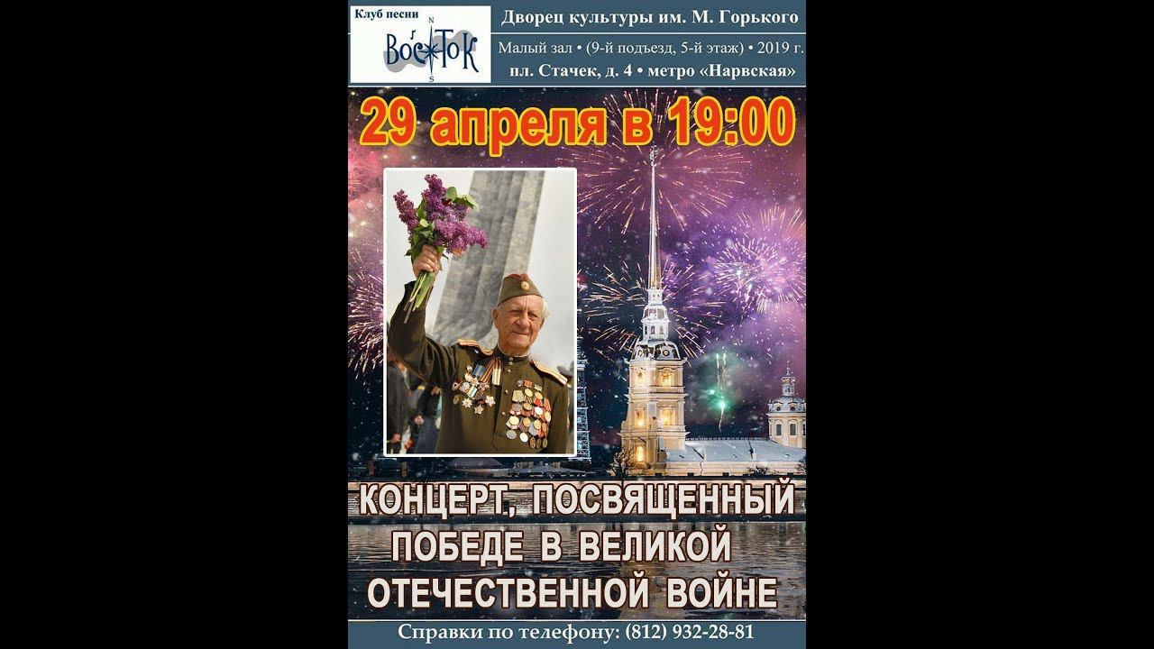 Концерт, посвящённый Дню Победы. Клуб песни «Восток». Санкт-Петербург, пл. Стачек, д. 4, ДК им. Горького, малый зал. 29 апреля 2019 г. Запись видео - Алла Левитан. Запись звука - Николай Алфёров. 0:00:37 Ведущая – Елена Гудкова 0:02:16 Мария и Геннадий Демины – Ты припомни, Россия… (И. Катаев – М. Анчаров) 0:04:25 Евгения Шароглазова и Роман Быстрицкий (студия «Атланты»), Игорь Яковлев – В городском саду (мелодия М. Блантера) 0:10:45 Тамара Фирсова и Борис Тарасов – День летнего солнцестояния (стихи и муз. Ю. Визбора) 0:14:25 Валерий Егоров – Ты помнишь, Алёша, дороги Смоленщины… (В. Егоров – К. Симонов) 0:19:47 Наталья Астраханцева – Синий платочек (Е. Петербуржский – Я. Галицкий, М. Максимов) 0:23:19 Сергей Суворов – Возвращение победителей (А. Краснопольский – В. Шостко) 0:27:18 Елена Адрианова и Игорь Яковлев – Фронтовая (О. Сандлер – Б. Туровский) 0:31:28 Светлана Широва и Юлиан – Смуглянка (А. Новиков – Я. Шведов) 0:36:22 Владимир Шемшученко – Я здесь не жил в блокаду... (стихи В. Шемшученко) 0:37:47 Владимир Шемшученко – Волховская застольная (И. Любан – П. Шубин) 0:42:10 Валентин Вихорев – И сколько было б пацанов… (стихи В. Вихорева) 0:43:34 Валентин Вихорев, Валерий Рохварг, Игорь Яковлев – Травы к осени будто с проседью... (стихи и муз. В. Вихорева) 0:47:41 Сергей Суворов – Война (В. Качан – Л. Филатов) 0:50:39 Борис Тарасов – В дороге (С. Никитин – И. Уткин) 0:53:26 Михаил Семененко, Валерий Рохварг и Игорь Яковлев – Десятый наш десантный батальон (стихи и муз. Б. Окуджавы) 0:57:25 Владимир Фатеев – Он не вернулся из боя... (стихи и муз. В. Высоцкого) 1:01:20 Тамара Фирсова – В сельском клубе (В. Берковский – Р. Ольшевский) 1:05:11 Светлана Широва и Юлиан Афанасьев – Алёша (Э. Колмановский – К. Ваншенкин) 1:09:23 Ольга Гончарова – Мой милый, если б не было войны (М. Минков – И. Шаферан) 1:13:34 Михаил Семененко, Валерий Рохварг и Игорь Яковлев – Облака (стихи и муз. В. Егорова) 1:17:57 АлександрТимофеев, Сергей Ильин – Язычник (стихи и муз. А. Тимофеева) 1:21:04 Александр Тимофеев, Сергей Ильин – Спокойно, старик! (стихи и муз. А. Тимофеева) 1:25:48 Наталья Астраханцева – Песня кумушки (русская народная песня) 1:30:27 Мария и Геннадий Демины – Вальс (Э. Колмановский – А. Галич) 1:33:53 Сергей Ильин, Татьяна Шевченко, Валерий Рохварг – День Победы (стихи и муз. Т. Гальперина) 1:39:41 Михаил Семененко, Валерий Рохварг и Игорь Яковлев и все участники – Я люблю тебя, жизнь (Э. Колмановский – К. Ваншенкин) В программе были использованы воспоминания А.А. Шаймардинова, Ф. Григорьева, В. А. Евдокимовой, К. В. Субботы, Б. Жакупова, С. Е. Хамкина, Ж. Б. Тлеуова, К. Духанина, А. Григорьевой, отрывки из книги Светланы Алексиевич «У войны не женское лицо», текст письма И. Молодкина.